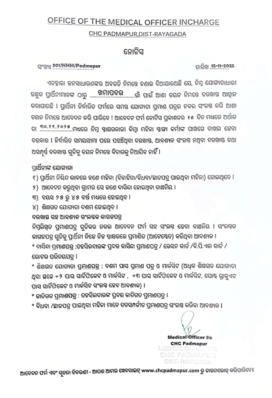- Ayushman Arogya Sibira for November 2025 will be conducted at CHC Padmapur on 21.11.2025 by Dr P K Panda,O&G Specialist